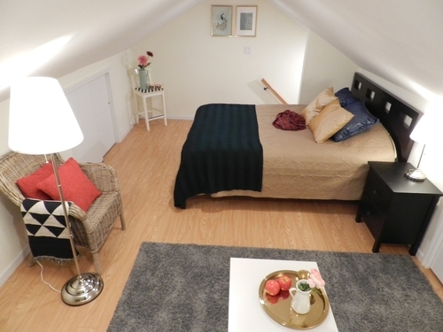 ・Full-size bed, table, chair, trash bin, floor light